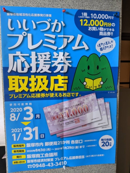 飯塚市プレミアム商品券当店でも使えます! 2020-07-31 14:23:16 平素より当店をご利用いただき誠にありがとうございます。8月3日から飯塚市のプレミアム商品券を当店でも使えますのでこの機会に是非ご利用の程お願い致します。